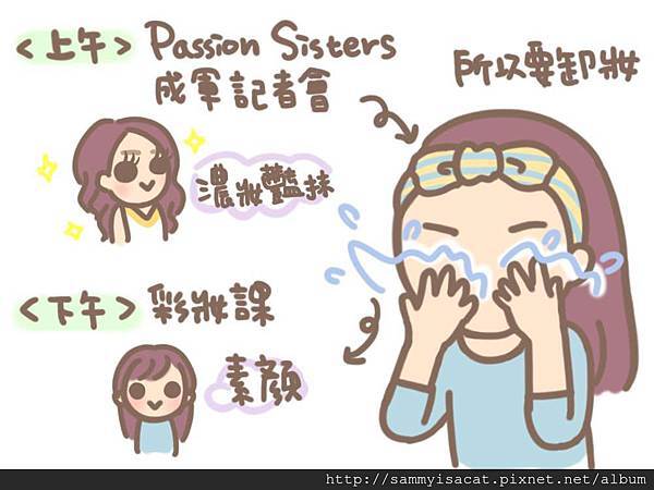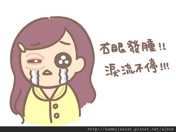 在比賽前一天卸妝時不小心把眼角膜刮破皮,造成眼淚流不停、流眼淚就讓眼睛水腫!
